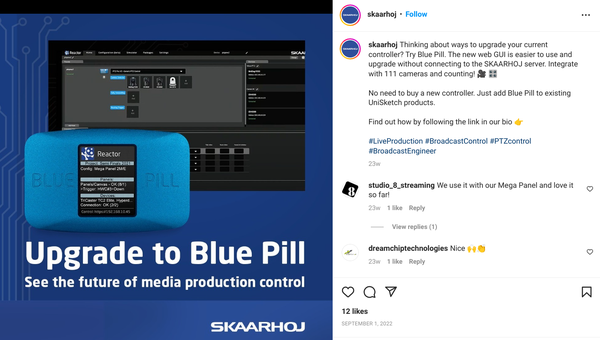Blue Pill Inside products update through the local devices IP address and any web browser. Users also have the benefit of using an updated web GUI. Previous generations of SKAARHOJ products used the UniSketch platform. While the interface was a great first step into broadcast control, the new user interface is simple to use for a one person production or a power user controlling multiple panels and controllers. Dive into why Blue Pill is the next choice for your production setup.